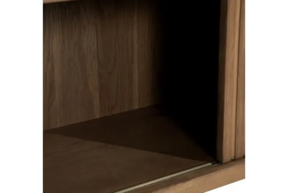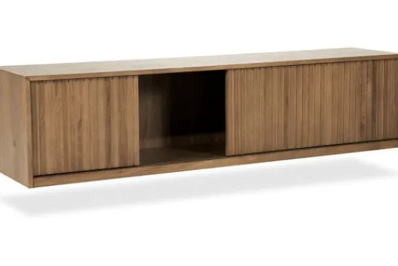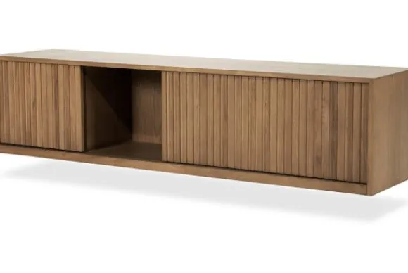 Het hangend tv-meubel is gemaakt van eikenhout en eiken fineer in een bruine uitvoering. De houtstructuur blijft zichtbaar en geeft het meubel een natuurlijke uitstraling. De schuifdeuren zijn voorzien van verticale groeven en zorgen voor een strak front.