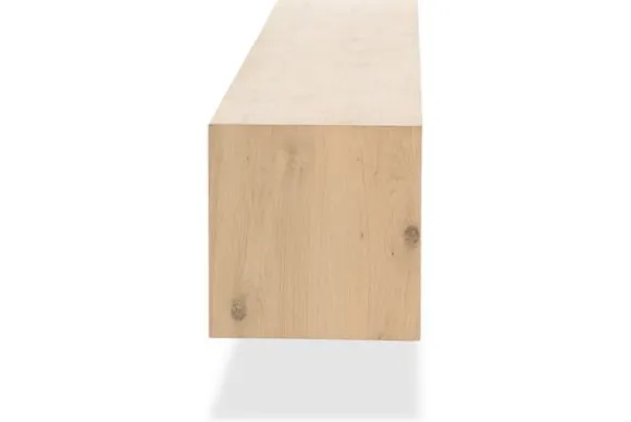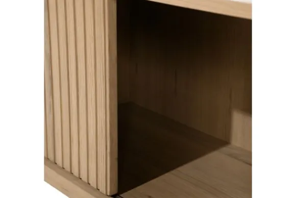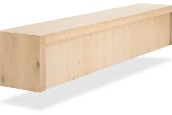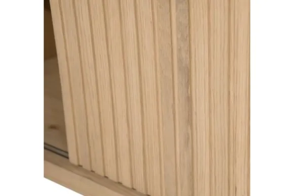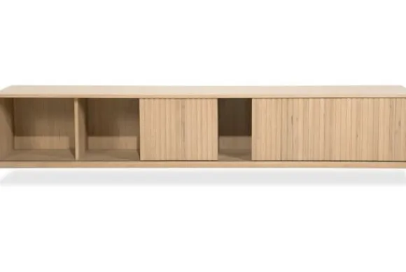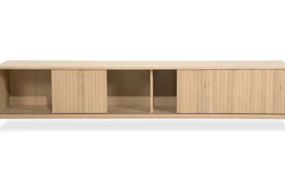 Het hangend tv-meubel is gemaakt van eikenhout en eiken fineer in een naturel uitvoering. De houtstructuur blijft zichtbaar en geeft het meubel een natuurlijke uitstraling. De schuifdeuren zijn uitgevoerd met verticale latten, wat zorgt voor een duidelijke en rustige belijning aan de voorzijde.