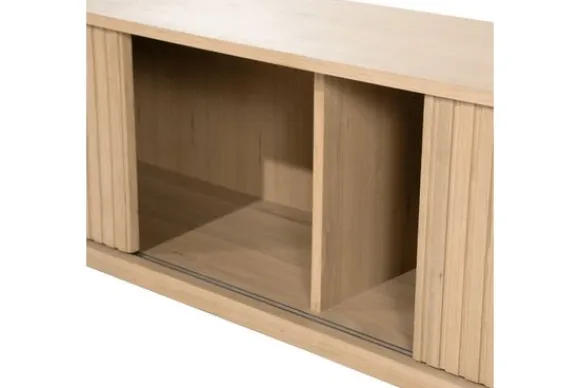 Achter de schuifdeuren bevindt zich gesloten opbergruimte voor apparatuur en kabels. De open vakken bieden ruimte voor mediatoestellen of accessoires.