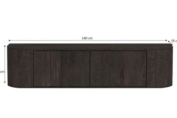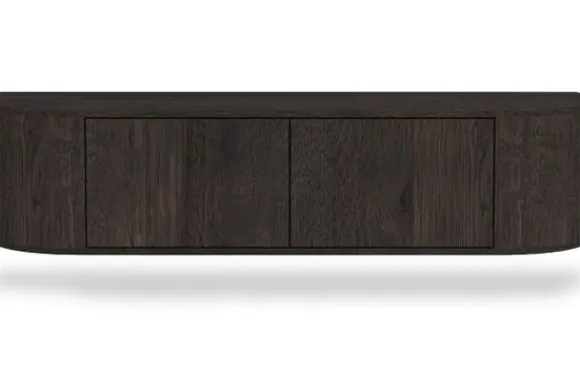 Hangend tv-meubel Novero van het merk Livingfurn is een wandmeubel met afgeronde vormen en een donkere houtkleur. Door het zwevende ontwerp blijft de vloer vrij, wat zorgt voor een open indeling en praktisch bij stofzuigen.
