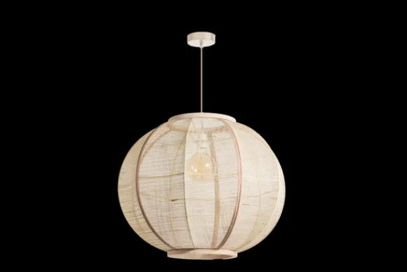 Hanglamp Fabric van het merk ETH is een moderne lamp met een bolvormige kap van fijn geweven stof. De open structuur van het houtkleurige frame zorgt voor een speels lichteffect en maakt deze lamp een echte blikvanger boven de eettafel.