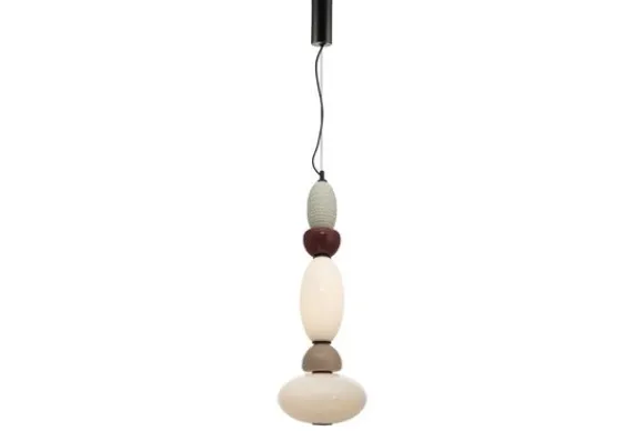 De combinatie van glanzend glas en gestructureerd keramiek geeft de lamp een sculpturale, moderne en artistieke look. De zachte witte en aardse tinten zorgen voor een warme gloed en maken de lamp tot een sfeervol element in de ruimte.
