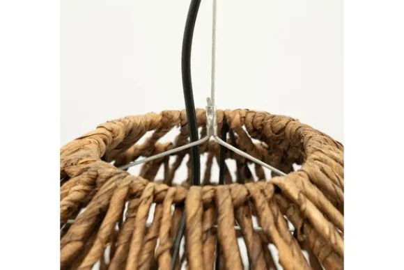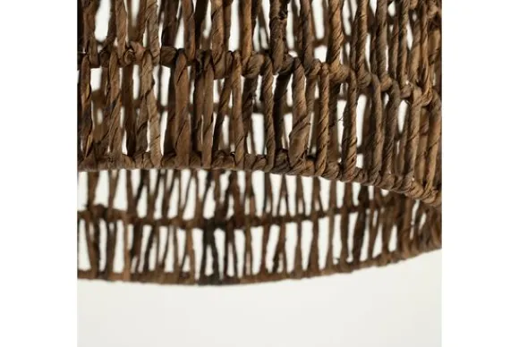 De handgeweven structuur vormt een open, luchtige kap die een subtiel spel van licht en schaduw creëert. De warme, bruine kleur van het vlechtwerk voegt een aards en stijlvol tintje toe, terwijl de organische vorm zorgt voor een zachte en uitnodigende uitstraling.