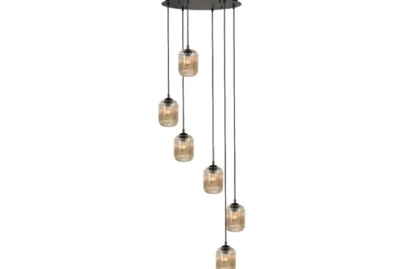 Hanglamp Castel Amberglas van het merk Highlight heeft zes lampen met glazen lampenkappen. Deze zes lampen zijn verstelbaar in lengte. De maximale lengte is 160 cm. De lampen kunnen op verschillende hoogtes gehangen worden, waardoor je een speels effect creeërt. Door het amberglas heb je naast sfeervol zijwaarts licht ook goed licht dat naar beneden schijnt.