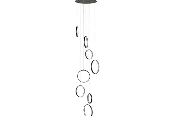 Hanglamp Olympia Zwart van het merk Highlight bestaat uit acht zwartkleurige ringen die een diameter van 25 cm, 30 cm en 35 cm hebben. De ringen zijn los van elkaar in hoogte te verstellen. De lamp heeft een maximale lengte van 330 cm. De plafondbevestiging heeft dezelfde kleur als de ringen en heeft een diameter van 56 cm. In de ringen zitten LED-strips die collectief 70W verbruiken.