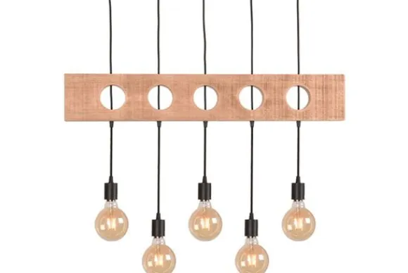 Hanglamp Timber bestaat uit een rechthoekige, zwarte plafondplaat voorzien van vijf verticaal lopende strijkijzerkoorden die met elkaar een mooi lijnenspel vormen. Aan elk einde van een strijkijzerkoord tref je een metalen fitting. Er bevindt zich een prachtige rough mango houten, massieve balk zwevend boven de fittingen. Deze balk is voorzien van vijf ronde uitsparingen, waar de strijkijzerkoorden doorheen geregen zijn en tevens een prachtige open structuur geven. Door de strakke maar speelse vormen, open structuur en focus op de lichtbron, is het aan te raden mooie spiraallampen te gebruiken als lichtbron, tevens te vinden in het LABEL51 assortiment. Op deze manier is sfeer gegarandeerd!