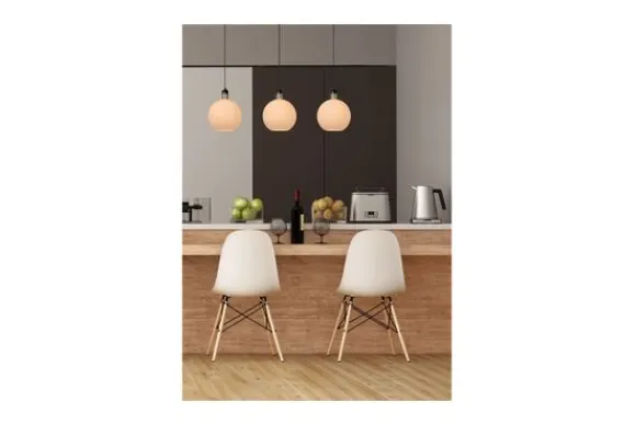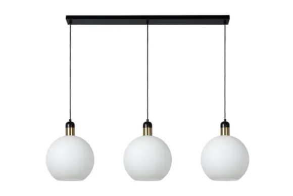 Hanglamp Julius Opaal van het merk Lucide heeft bovenaan een langwerpige bevestigingsplaat waaruit drie lichtbollen neerdalen aan hun textiel kabels. De glazen bollen zijn afgewerkt in een opaaljasje. De lichtbollen zijn eenvoudig in hoogte verstelbaar voor de installatie. Je laat ze maximaal anderhalve meter naar beneden bengelen vanaf het plafond. Netjes op een rij of waarom niet elk op hun eigen hoogte?