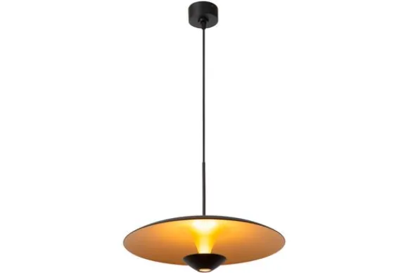 Hanglamp Kenneth van het merk Lucide is een moderne en stijlvolle lamp met een strak ontwerp en luxe afwerking. De platte, ronde kap in matzwart aluminium zorgt voor een strakke uitstraling, terwijl de goudkleurige binnenzijde warm licht weerkaatst en direct sfeer brengt in de ruimte.