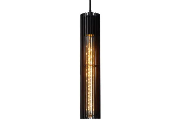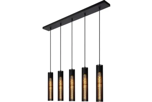Hanglamp Lionel van het merk Lucide is een stijlvolle verschijning met een moderne industriële uitstraling. De vijf slanke, cilindervormige kappen van zwart metaal zijn voorzien van fijne lamellen die het licht op een sfeervolle manier filteren. Het ontwerp combineert elegantie met stoer karakter en voegt diepte en warmte toe aan elke ruimte.