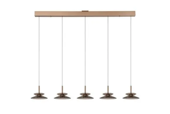 Hanglamp Santiago van het merk Lucide is een verfijnde lamp met een moderne uitstraling. De vijf glazen kappen verspreiden een warm, sfeervol licht dat ideaal is boven een eettafel of kookeiland. Het elegante ontwerp en de hoogwaardige afwerking geven deze lamp een luxueuze uitstraling die past in elke stijlvolle woonruimte.