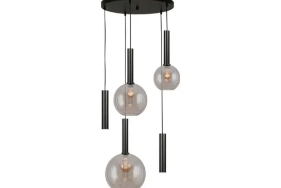 Hanglamp 2982-05-50-5RB202123 Bella van het merk Masterlight is een klassieke en sierlijke lamp. De hanglamp heeft drie formaten lampenkappen die gemaakt zijn van goud fuméekleurig glas en twee smalle dappled oilkleurige lampenkappen. Fuméeglas is getint glas met een kleurverloop. Door het kleurverloop krijgt het licht in je ruimte een sfeervolle en intieme uitstraling. De klassieke lamp combineert mooi met de zwarte metalen afwerking en komt goed tot zijn recht in verschillende soorten ruimtes. Hang de hanglamp boven je eettafel, salontafel of in de hal. De drie glazen lampenkappen hebben een E27 fitting en de twee smalle lampenkappen hebben een GU10 fitting. De hanglamp wordt zonder lichtbron geleverd. Maak de lamp compleet door in de winkelmand je lichtbron toe te voegen.