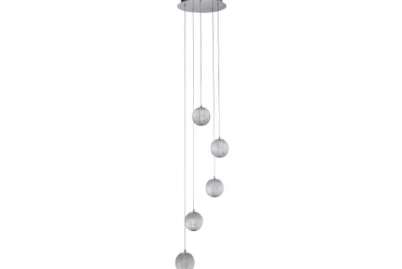 Hanglamp Allure 51481-5CC van het merk Searchlight is een elegante chrome lamp met vijf LED-lampen in acrylbollen die druppelsgewijs aan de plafondkap hangen. De getextureerde acrylbollen voegen diepte toe, waardoor deze lamp dé blikvanger van jouw kamer wordt.