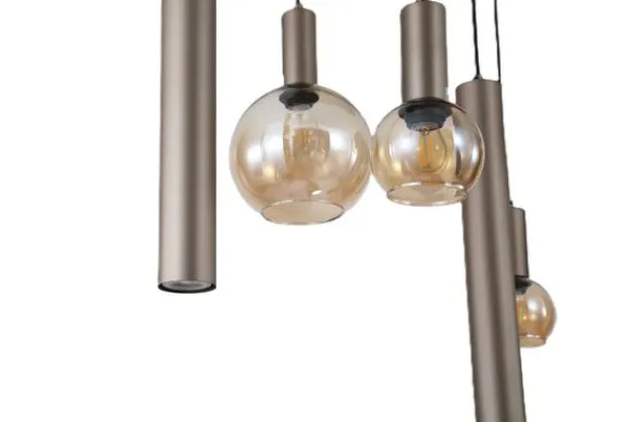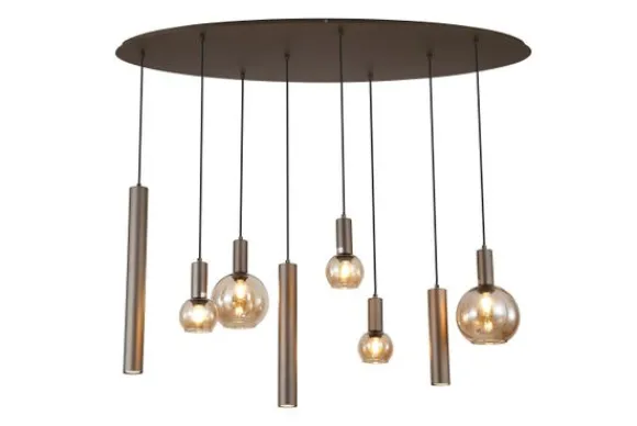 Hanglamp Lyon 76318-8LT van het merk Searchlight is een opvallende lamp die direct de aandacht trekt. Het ontwerp bestaat uit een speelse combinatie van cilindervormige pendels en amberkleurige glazen bollen, waardoor er een dynamisch en sfeervol lichteffect ontstaat. De warme taupe metalen afwerking zorgt voor een chique en moderne uitstraling.