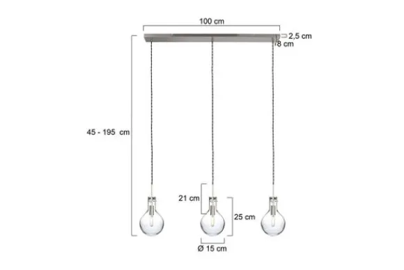Hanglamp Elegance 1892ST van het merk Steinhauer is een 3-lichts hanglamp. Tijdens het monteren van de lamp kan je de hoogte bepalen. De maximale hoogte is 180 centimeter en minimale hoogte is 45 centimeter. De plafondbak is 100 centimeter lang. Beschikt over drie E14 fittingen en wordt geleverd inclusief lichtbron van 2 watt, 2700 Kelvin en 200 Lumen. De diameter van de glazen bol is 16 centimeter en 25 centimeter hoog. De lamp is dimbaar via een externe dimmer met een onderwaarde van 0-20 watt.