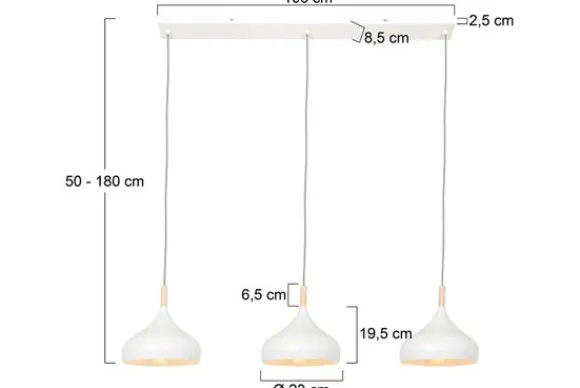 De kap heeft een diameter van 23 cm en een hoogte van 19,5 cm. Tijdens montage is de lamp in hoogte verstelbaar tot maximaal 180 cm.