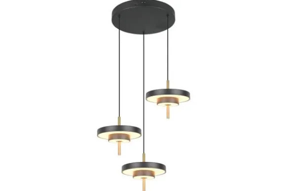 Hanglamp Keaton 340230380 van het merk Trio Lighting is een moderne hanglamp met geïntegreerde LED verlichting. De drie ronde lichtschijven zorgen voor een gelijkmatige lichtverdeling en maken deze lamp geschikt voor boven de eettafel of het kookeiland.