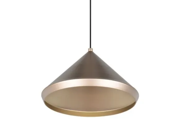 Hanglamp Laguna van het merk Trio Lighting is een moderne lamp met een elegante, kegelvormige kap van bruin metaal. De zachte glans van het oppervlak geeft de lamp een warme uitstraling, terwijl het strakke ontwerp zorgt voor een hedendaagse en verfijnde look. Perfect voor boven de eettafel, het kookeiland of als sfeervolle accentverlichting.