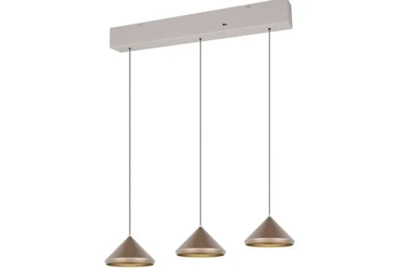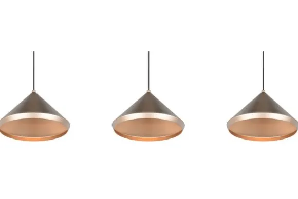 Hanglamp Laguna 336210365 van het merk Trio Lighting is een moderne en stijlvolle lamp met drie kegelvormige kappen van koffie gekleurd metaal. De nette afwerking en de strakke lijnen geven de lamp een verfijnde uitstraling die zowel elegant als tijdloos oogt. Perfect boven een eettafel of kookeiland, waar ze zorgt voor een gelijkmatige en sfeervolle verlichting.