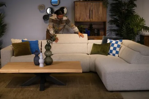 Hoekbank Saskia van het merk Savoy heeft een strak design door de zitting die tot de grond loopt. Elke zitting is standaard uitgevoerd met een handmatige hoofdsteun. Je kunt zelf kiezen of je deze omlaag geklapt wil voor een ruimtelijke look of omhoog voor een fijne ondersteuning. De nosagvering en koudschuim vulling zorgen voor een goede zit.