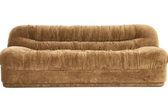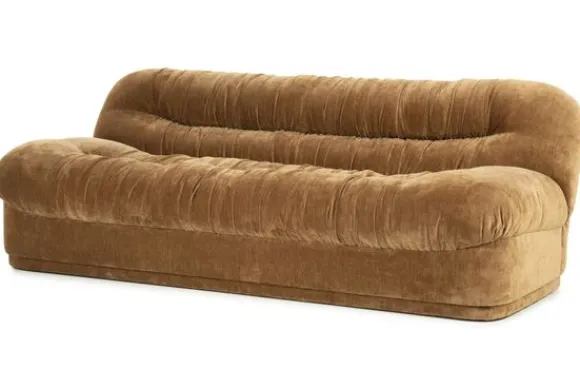 De royale zitting en rugleuning zijn rijkelijk gevuld en voorzien van zachte plooien die een speelse beweging in het ontwerp brengen. De bekleding in polyester voelt heerlijk zacht aan en geeft de bank een luxe en tijdloos karakter.