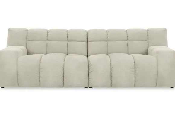 Bankstel Trentino van het merk Moderno is een bank met geblokte zit- en rugkussens en een zitting die doorloopt tot net boven de grond.