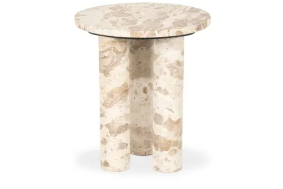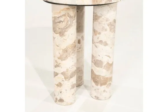 De drie cilindervormige poten geven bijzettafel Marmo een sculpturaal effect dat direct in het oog springt. Door de combinatie van vorm en materiaal ontstaat een moderne look die warmte toevoegt aan elke ruimte.