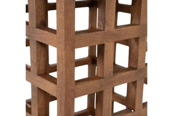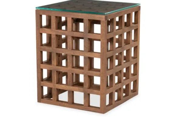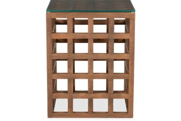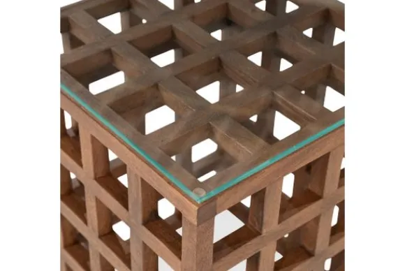 Bijzettafel Heras 96574 van het merk Eleonora is uitgevoerd in mangohout met een vierkant glazen blad. De open structuur bestaat uit een strak raster van houten vakken. Het glazen blad ligt boven op het frame en heeft een transparante afwerking. De warme houtkleur laat een natuurlijke nerf zien.
