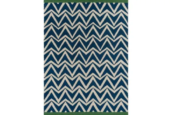 Buitenkleed Dhurrie Blue Outdoor 426318 van het merk Scion Rug Collection is een echte sfeermaker voor binnen én buiten. Het design heeft een speels zigzagpatroon in blauw en beige, afgewerkt met een frisse groene rand, een grafisch accent dat direct karakter geeft aan je ruimte.