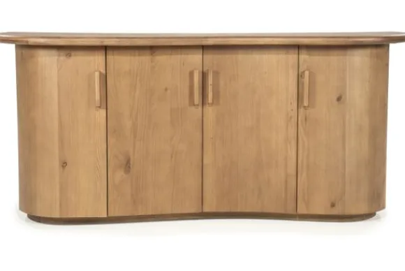 Het bovenblad en de deuren hebben een afgeronde afwerking, waardoor het meubel prettig oogt en makkelijk te plaatsen is in de ruimte. De deuren zijn voorzien van handgrepen die passen bij de rustige stijl van het ontwerp. Zo krijgt het dressoir een nette en verzorgde uitstraling die praktisch blijft in dagelijks gebruik.