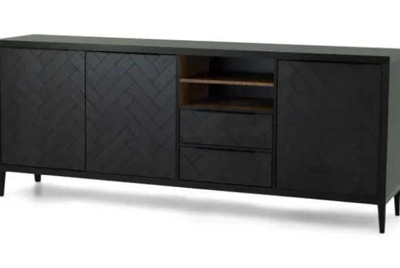 Dressoir Sugi Ban – Gamma van het merk Lamulux is een stoer dressoir met een warme uitstraling. De kleur Old Piano met accenten in Old Teak geeft het meubel een krachtig karakter. Het visgraatmotief op de fronten zorgt voor een herkenbaar detail dat past in een industrieel, modern of Japandi interieur.