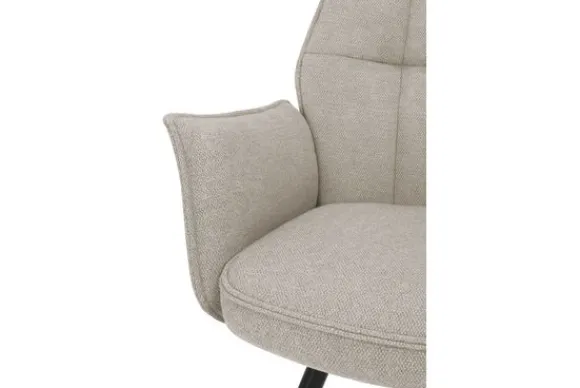 De hoge rugleuning en de subtiele armsteunen zorgen voor een ontspannen zit, terwijl de zwarte metalen poten een stoere en stabiele basis vormen. Het verfijnde stiksel in de rug geeft de stoel een luxe en eigentijdse uitstraling.