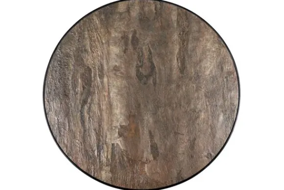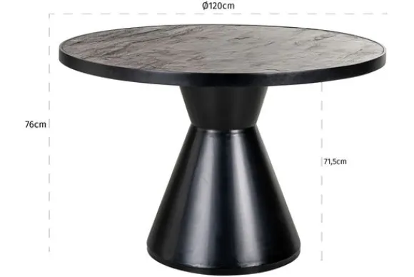 Eettafel Russel 211605 van het merk Richmond Interiors is vervaardigd uit steen fineer en een metalen poot. Steen fineer is een echte natuursteen in de vorm van fineer, niet dikker dan 2-3 mm. Het materiaal is zeer flexibel en licht van gewicht. De metalen poot is in de vorm van een koker en loopt taps naar buiten.