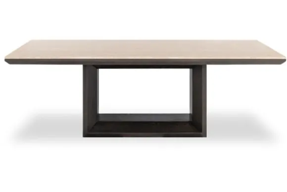 Het rechthoekige blad heeft een natuurlijke tekening die elk exemplaar uniek maakt. Het robuuste frame met open middenstuk geeft de tafel niet alleen stabiliteit maar ook een moderne uitstraling.