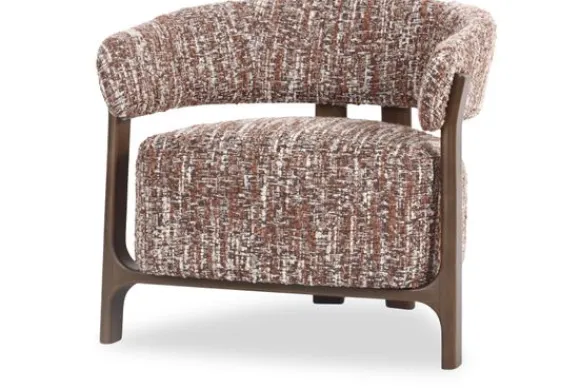 De fauteuil is bekleed met een grove, gemêleerde stof waarin verschillende bruine en crème tinten samenkomen. Dit geeft een levendig effect dat prachtig combineert met de warme houten poten.