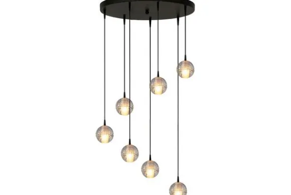 Hanglamp 2122-05-173-50-7 Bubbles van het merk Masterlight is een eenvoudige maar luxe lamp door de glazen lampenkap waarin luchtbellen zichtbaar zijn. De hanglamp heeft zeven transparante bubbellampenkappen met een diameter van 10 centimeter die zigzag onder elkaar hangen. De bubbellampenkappen zijn in de hoogte verstelbaar tot een maximale lengte van 350 centimeter. De lampenkap heeft aan de binnenkant een bulletvormige lichtbron wat voor een prachtig effect zorgt. Hang de hanglamp boven je eettafel, salontafel of in de hal… De lichtbron is inclusief bij deze lamp en is dimbaar met een externe dimmer.