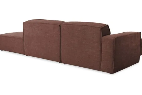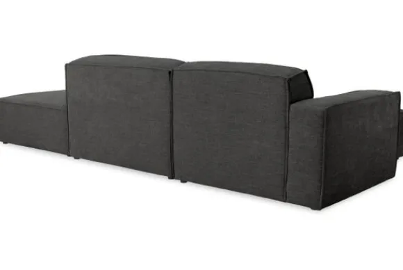 Zitbank Loki van het merk Dakota Industrial oogt robuust door de vaste kussens en de zitting die doorloopt tot net boven de grond. De bank heeft diepe zittingen en is afgewerkt met geknepen naden.