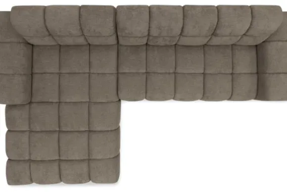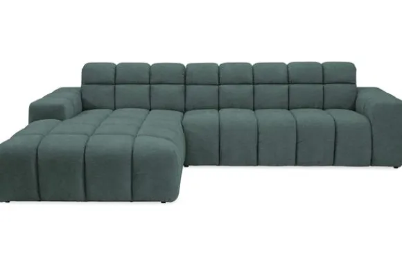 Bankstel Treviso van het merk Moderno is een bank met geblokte zit- en rugkussens en een zitting die doorloopt tot net boven de grond.