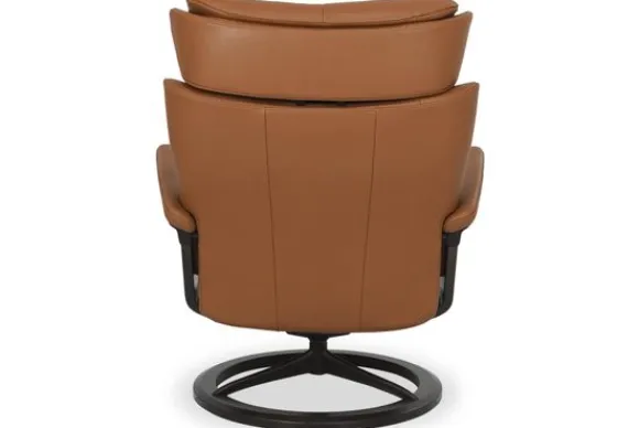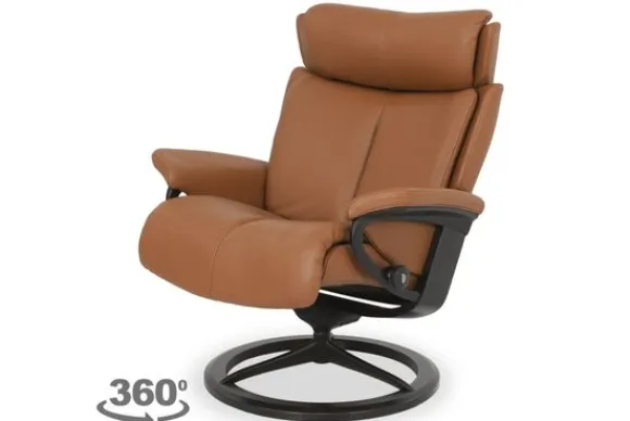 Relaxfauteuil Magic Signature van het merk Stressless is verkrijgbaar in meer dan 150 kleuren. Tevens is de fauteuil leverbaar in stof en rundleder. Je kunt bij deze fauteuil kiezen uit diverse maten zoals Small, Medium en Large. Deze fauteuil heeft een Plus en Glide Systeem: Aan beide zijden van de fauteuil zit een knop waarmee je de weerstand van de stoel kan aanpassen naar eigen behoefte. Door de knoppen in tegengestelde richting te draaien stel je jouw ideale relaxpositie samen. Op die manier krijgt de nek en de onderrug goede ondersteuning. Door de rugleuning naar voren te buigen activeer je de slaapfunctie. Op het moment dan je weer rechtop komt stelt de stoel zichzelf weer bij naar de normale stand.
