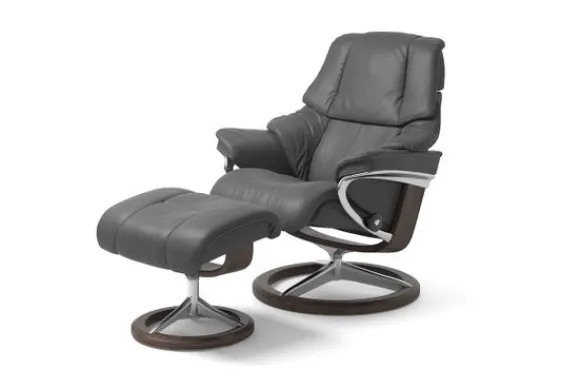 Relaxfauteuil Reno Signature van het merk Stressless is verkrijgbaar in alle kleuren. Tevens is de fauteuil leverbaar in stof en rundleder. Je kunt bij deze fauteuil kiezen uit diverse maten zoals Small, Medium en Large. Deze fauteuil heeft een Plus en Glide Systeem: Aan beide zijden van de fauteuil zit een knop waarmee je de weerstand van de stoel kan aanpassen naar eigen behoefte. Door de knoppen in tegengestelde richting te draaien stel je jouw ideale relaxpositie samen. Op die manier krijgt de nek en de onderrug goede onderstuening. Door de rugleuning naar voren te buigen activeer je de slaapfunctie. Op het moment dan je weer rechtop komt stelt de stoel zichzelf weer bij naar de normale stand.