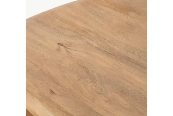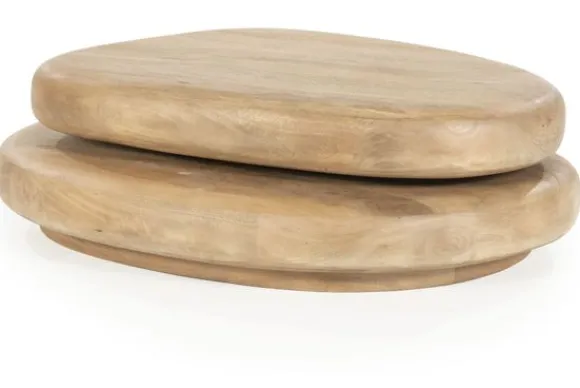 Gemaakt van massief mangohout in een lichte, warme bruintint, bestaat deze tafel uit twee organisch gevormde, overlappende bladen die lijken te zweven boven elkaar. De afgeronde randen en asymmetrische vormen geven het geheel een zachte, vloeiende uitstraling, alsof de tafel is gevormd door de natuur zelf.
