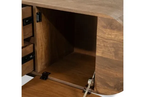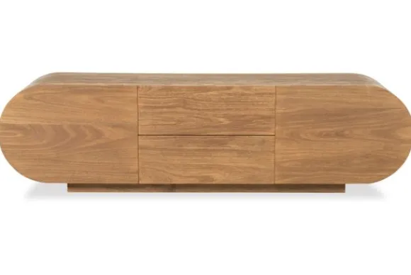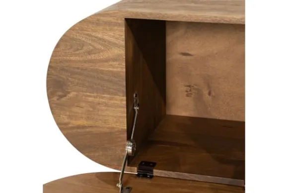 Het tv-meubel is gemaakt van mangohout en mango fineer. Het hout is geborsteld afgewerkt waardoor de nerf goed zichtbaar blijft. De afgeronde zijkanten en rechte lijnen zorgen voor een vloeiende vorm die eenvoudig te combineren is met andere meubels.