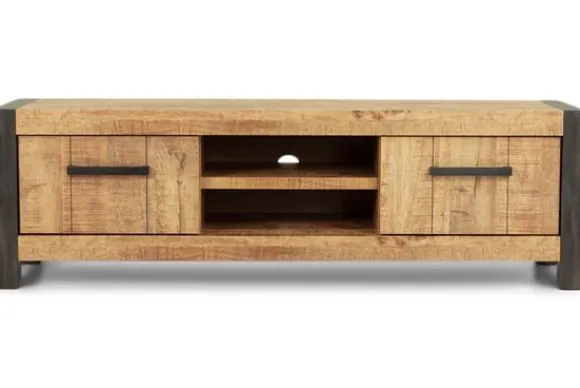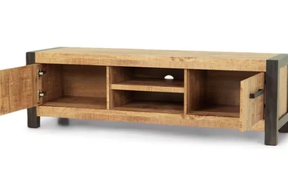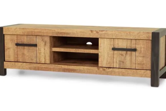 Tv-meubel Jatoba – City van het merk Lamulux is uitgevoerd in de kleur Mango. De sterke lamulux bovenlaag geeft het meubel een stoer decor dat goed past in moderne en industriële interieurs. Het tv-meubel heeft twee deuren met verticale planken en in het midden twee open vakken.