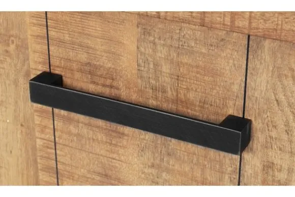 De metalen handgrepen en de grijze melamine zijkanten met metaallook versterken de robuuste uitstraling. De combinatie van houttinten en metaal zorgt voor een modern en krachtig karakter.
