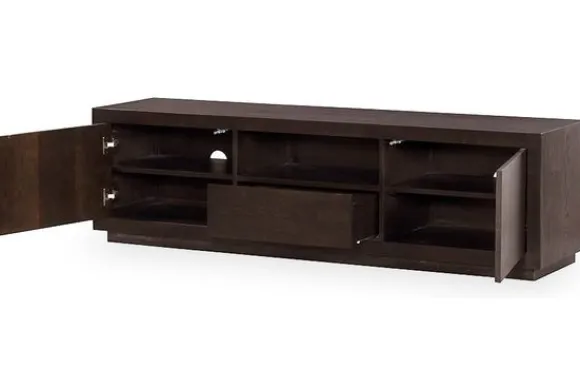 Tv-meubel Mincio van het merk Tower Living is een robuust meubel gemaakt van massief eikenhout in een diepe espressokleur. Het ontwerp straalt kracht uit en heeft een warme, natuurlijke uitstraling.