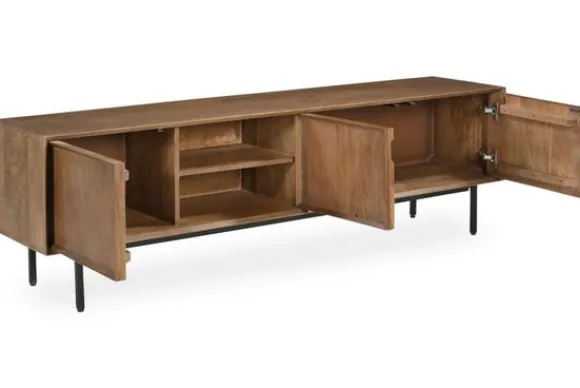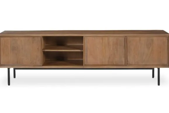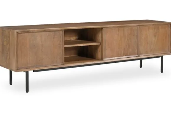 Tv-meubel Ravenstein van het merk Livingfurn is gemaakt van mangohout en geeft een strakke, minimalistische look aan de ruimte. De greeploze deuren en open vakken bieden zowel een minimalistische uitstraling als praktische opbergruimte voor media-accessoires en decoratieve eyecatchers.