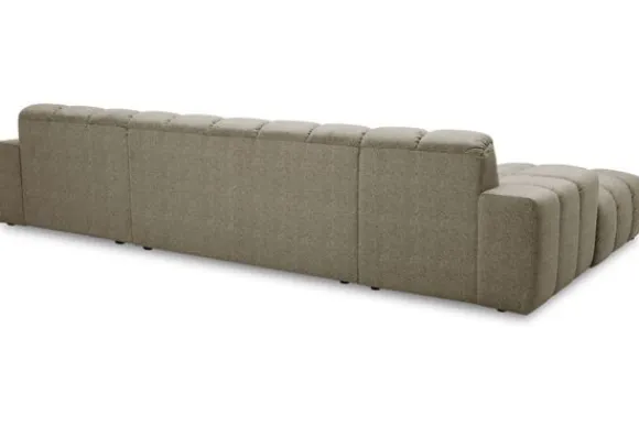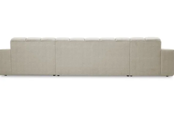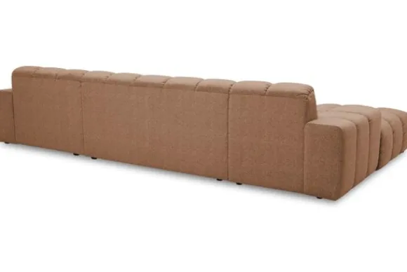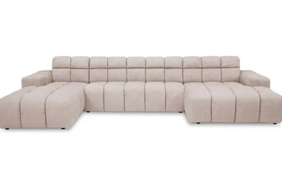 Bankstel Treviso van het merk Moderno is een bank met geblokte zit- en rugkussens en een zitting die doorloopt tot net boven de grond.