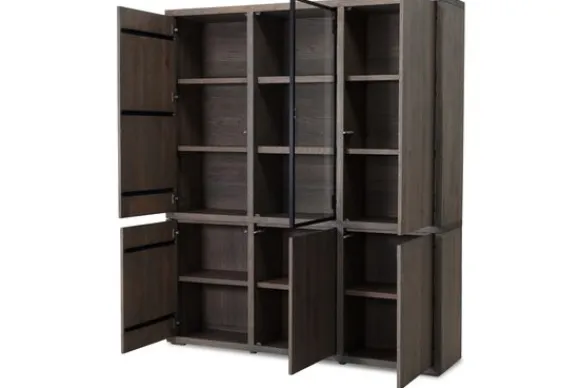 Vitrinekast Established van het merk Van Dijk Furniture is verkrijgbaar in verschillende kleuren 100% massief eikenhout. Eikenhout leeft en geeft hierdoor karakter aan jouw meubelstuk. Daarnaast is elk stuk uniek door de nerven en noesten. Deze kast heeft onderin drie dichte deuren, hierboven drie open vakken achter een glazen deur en daarnaast nogmaals twee dichte deuren. Veel display en opbergmogelijkheden dus! De dichte deuren zijn te openen met een push to open systeem. De kast is ook verkrijgbaar met LED-spots, dit is optioneel.