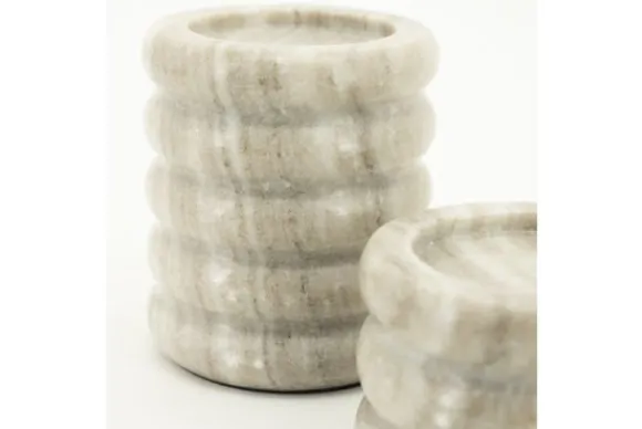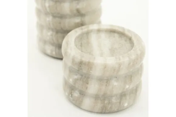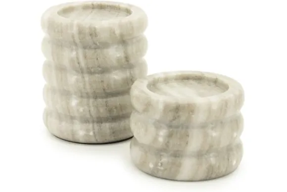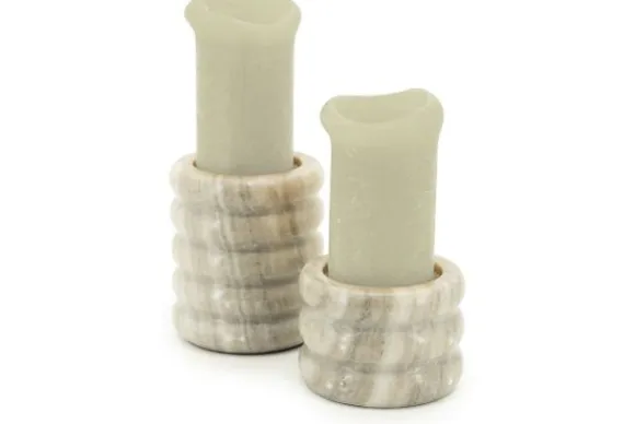 Kandelarenset Paloma 240206 van het merk By-Boo is een robuuste set gemaakt van marmer en bestaat uit twee kandelaars met afmetingen van 10×12 (ØxH, hoge kandelaar) en 10×8 (ØxH, lage kandelaar). Marmer is een duurzame steensoort en heeft een luxe en stijlvolle uitstraling. De steensoort is een natuurproduct en kenmerkt zich door de unieke afwerkingen en kan zowel grove als gladde delen bevatten. Door de kenmerkende kleurschakeringen en aders is geen product hetzelfde. Zo haal je met een marmer product dus echt iets unieks in huis.