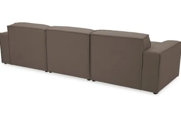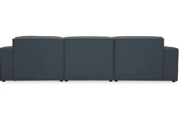 Zitbank Loki van het merk Dakota Industrial oogt robuust door de vaste kussens en de zitting die doorloopt tot net boven de grond. De bank heeft diepe zittingen en is afgewerkt met geknepen naden.