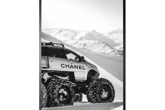 Art Print Chanel Sneeuwtruck FA-100 van het merk Luxe Framing Art is een zwart-witprint waarop een Chanel sneeuwtruck is afgebeeld. Op de achtergrond zijn besneeuwde bergtoppen te zien. Deze print is in verschillende maten verkrijgbaar en wordt standaard geleverd met een zwarte lijst.